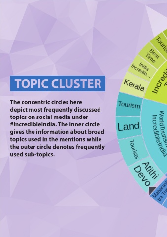 The concentric circles here depict most frequently discussed topics on social media under #IncredibleIndia. The inner circle gives the information about broad topics used in the mentions while the outer circle denotes frequently used sub-topics.
