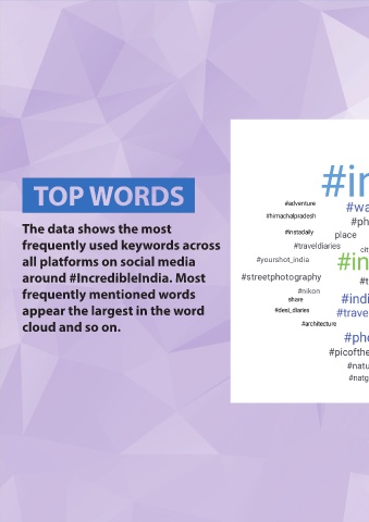 The data shows the most frequently used keywords across all platforms on social media around #IncredibleIndia. Most frequently mentioned words appear the largest in the word cloud and so on.